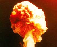 Bombanın çevrildiği gaz kütlesinin sıcaklığı, bir anda birkaç milyon dereceye ve gaz basıncı da bir milyon atmosfere çıkar. - Patlamadan saniyenin binde biri kadar sonra... Patlamış olan gaz kütlesinin çapı büyür ve etrafa çeşitli ışınlar yayılır. Bu ışınlar patlamanın 'başlangıç parlaması'nı oluşturur. Bu parlama onlarca kilometre çapında bir alanda bulunabilecek herhangi bir kişide tam körlüğe neden olabilir. Öyle ki bu parlak ışık (yüzey birimi başına), güneş yüzeyinden yayılandan yüzlerce kat daha büyüktür. Patlama anından başlayarak geçen zaman öylesine kısadır ki, patlamanın yakınında bulunan bir kişi gözlerini kapayabilecek zaman bile bulamamıştır. Şokun basınç cephesi kapalı kapılarda ağır hasarlara yol açar. Buna karşılık elektrik taşıma kuleleri, iki parçadan oluşan köprüler ve cam-çelik yapılı gökdelenler de hasar görürler. Patlamanın yakınlarında da büyük oranda, pudraya benzer ince toz kalkar. - Patlamadan 2 saniye sonra... Parlayan kütle ve onu çevreleyen hava, bir ateş topu oluşturur. Yüzeyi henüz son derece sıcak ve güneşinki kadar, hatta daha parlak olan bu ateş topundan yayılan ısı, 4-5 km çapındaki bir alandaki tüm yanabilir maddeleri yakmaya yeterlidir. Ateş topunun parlaklığı da, hala görme duyusuna, düzeltilemeyecek kadar zarar verebilir derecededir. Burada ateş topunun çevresinde, çok büyük bir hızla yer değiştiren şok dalgası gelişmiştir. - Patlamadan 6 saniye sonra... Bu anda şok dalgası yeryüzüne çarpar ve ilk mekanik zararlara neden olur. Dalga, şiddetli bir hava basıncı yaratır ve bu basıncın şiddeti patlama merkezinden uzaklaştıkça azalır. Bu noktadan yaklaşık 1.5 km uzakta bile, ek basınç, normal atmosfer basıncının yaklaşık iki katı olur. Bu basınçta insanların sağ kalabilme şansı %1'dir. - Patlamadan 13 saniye sonra... Şok dalgası yerin yüzeyinde yayılır ve bunu, ateş topunun kovduğu havanın yer değiştirmesi nedeniyle oluşan patlama izler. Bu patlama yer boyunca 300-400 km/saatlik bir hızla yayılır. Bu arada ateş topu soğumuş ve hacmi küçülmüştür. Havadan hafif olduğundan yükselmeye başlar. Yukarıya doğru yönelmiş bu hareket, yeryüzünde rüzgarın yönünün tersine dönmesine yolaçar ve şiddetli bir rüzgar, başlangıçta patlama merkezinden dışarı doğru eserken, şimdi merkeze doğru esmeye koyulur. - Patlamadan 30 saniye sonra... Ateş topu yükseldikçe, küre biçimindeki şekli bozulur ve resimde görüldüğü gibi tipik bir mantar görünümünü alır. - Patlamadan 2 dakika sonra... Mantar biçimli bulut şimdi 12.000 metrelik bir yüksekliğe, yani atmosferin stratosfer tabakasının alt sınırına ulaşmıştır. Bu kadar yüksek düzeyde esen rüzgarlar, mantar biçimindeki bulutu azar azar dağıtır ve bulutu oluşturan maddeleri (genel olarak radyoaktif döküntüleri) atmosfere dağıtır. Sözkonusu bu radyoaktif döküntüler, çok küçük tanecikler olduklarından atmosferde daha yüksek katmanlara da çıkabilirler. Bu döküntüler yeryüzüne düşmeden evvel, atmosferin üst tabakalarında esen rüzgarlar tarafından dünyanın çevresinde birkaç kez döndürülebilirler. Böylece radyasyon döküntüleri dünyanın dört bir yanına dağılabilir. ATOMDAN ÇIKAN RADYASYON Radyasyon, uzayda saniyede 200.000 km gibi çok yüksek bir hızda hareket eden, gama ışınları, nötronlar, elektronlar ve benzeri birkaç tip atom-altı parçacıktan oluşur. Bu parçacıklar, kolaylıkla insan vücuduna kolaylıkla nüfuz edebilir ve vücudu oluşturan hücrelere hasar verebilirler. Bu hasar ölümcül bir kanserin ortaya çıkmasına neden olabilir ya da üreme hücreleri içinde yer alırsa, gelecek kuşakları etkileyecek genetik bozukluklara yol açabilir. Bu yüzden, bir radyasyon parçacığının insana çarpmasının sonuçları son derece ciddidir. Atom patlamalarında ortaya çıkan ışınlar canlılar üzerinde ya doğrudan doğruya veya patlama sırasında ortaya çıkan parçalanma ürünleri yoluyla etki yapar. Bu parçacık ya da ışınlardan biri madde içinde hızla yol alırken, karşısına çıkan atom ya da moleküllerle çok şiddetli bir şekilde çarpışır. Bu çarpışma, hücrenin hassas yapısı için felaket olabilir. Hücre ölebilir ya da iyileşebilir. Hücre iyileşse bile, içinde belki haftalar, aylar, yıllar sonra kanser dediğimiz kontrol edilemeyen bir büyüme başlar. Merkezi patlama noktasından aşağı yukarı 1.000 metre çapındaki alan içerisinde radyasyon çok yoğundur. Ölüme yol açan öteki etkilerden kurtulanlar kanlarındaki akyuvarların hemen hepsini kaybeder, derilerde yaralar belirir, bunların hepsi birkaç günden iki üç haftaya kadar varan kısa bir süre içinde kanamadan ölür. Patlama noktasından daha uzakta olanlar üzerinde radyasyonun etkisi değişiktir. Ateş topundan yayılan bu zararlı ışınlarla karşı karşıya kalan insan bedeninde 13, 16 ve 22 km. uzaklıklarda sırasıyla üçüncü, ikinci ve birinci dereceden yanıklar oluşur. Sindirim bozuklukları ve kanamalar daha hafiftir, asıl bozukluklar daha sonra ortaya çıkar. Saçların dökülmesi, deri yanıkları, kansızlık, kısırlık, çocuk düşürme, sakat çocuk doğurma... Bu örneklerde dahi on günden üç aya kadar bir süre içinde ölüm görülebilir. Yıllar geçtikten sonra bile göz bozuklukları (göze perde inmesi), kan kanseri (lösemi) ve ışınım kanseri görülebilir. Hidrojen bombası patlamalarının en büyük tehlikelerinden biri radyoaktif tozların solunum, sindirim ve deri yoluyla vücuda girmesidir. Bu tozlar bulaşmanın azlığına-çokluğuna göre yukarıda saydığımız bozukluklara sebep olurlar. Tüm bu sayılanlara, gözümüzle bile göremediğimiz atomlar sebep olmaktadır. Atomlar gerektiğinde hayatı oluştururlarken, gerektiğinde de hayatı yokederl