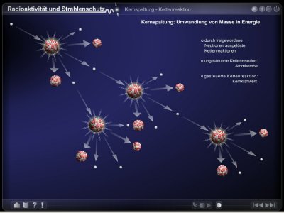 Several isotopes of uranium undergo induced fission. But the only naturally occurring isotope in which we can induce fission with thermal neutrons is 235U, which is present at an abundance of only 0.72%. The induced fission of this isotope releases an average of 200 MeV per atom, or 80 million kilojoules per gram of 235U. The attraction of nuclear fission as a source of power can be understood by comparing this value with the 50 kJ/g released when natural gas is burned. The first artificial nuclear reactor was built by Enrico Fermi and co-workers beneath the University of Chicago's football stadium and brought on line on December 2, 1942. This reactor, which produced several kilowatts of power, consisted of a pile of graphite blocks weighing 385 tons stacked in layers around a cubical array of 40 tons of uranium metal and uranium oxide. Spontaneous fission of 238U or 235U in this reactor produced a very small number of neutrons. But enough uranium was present so that one of these neutrons induced the fission of a 235U nucleus, thereby releasing an average of 2.5 neutrons, which catalyzed the fission of additional 235U nuclei in a chain reaction, as shown in the figure below. The amount of fissionable material necessary for the chain reaction to sustain itself is called the critical mass.