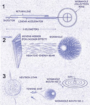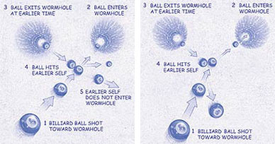 THE NOTORIOUS MOTHER PARADOX (sometimes formulated using other familial relationships) arises when people or objects can travel backward in time and alter the past. A simplified version involves billiard balls. A billiard ball passes through a wormhole time machine. Upon emerging, it hits its earlier self, thereby preventing it from ever entering the wormhole. RESOLUTION OF THE PARADOX proceeds from a simple realization: the billiard ball cannot do something that is inconsistent with logic or with the laws of physics. It cannot pass through the wormhole in such a way that will prevent it from passing through the wormhole. But nothing stops it from passing through the wormhole in an infinity of other ways. Hiçbir yazı/ resim kaynak gösterilmeden kullanılamaz!! Telif hakları uyarınca bu bir suçtur..! Tüm hakları Çetin BAL' a aittir. © 1998 Cetin BAL - GSM:05366063183 -Turkiye/Denizli How to Build a Time Machine Bir zaman makinesi nasıl yapılır? |