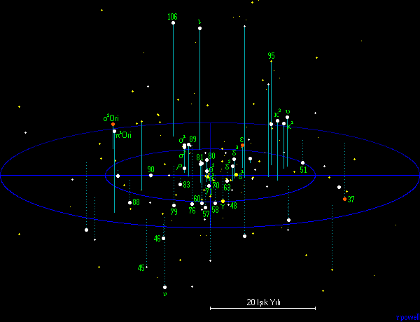 Boğa (Hyades) Yıldız KümesiBoğa (Öküz) Kümesi büyük yıldız kümelerinden en yakın olanıdır ve üç boyutlu haritasının yapılabilmesi için yeterince yakın olması açısından tektir. Boğa Kümesi, Boğa Takımyıldızı içinde parlak bir cisimdir. Ancak görüntü Eldeberan (kümenin önünde, bize olan uzaklığının yarısından daha yakında bulunan parlak turuncu dev bir yıldız) tarafından bir miktar bozulur. Kümenin bize olan uzaklığı 151 ışıkyılıdır. Yaklaşık 660 milyon yıl önce oluşmuştur ve o zamandan beri gökadamız etrafında büyük olasılıkla üç kez dönmüştür. Açık yıldız kümelerinin çoğunda olduğu gibi, Boğa Kümesi'ndeki yıldızlar yavaşça birbirlerinden ayrılmaktadır. ![]()