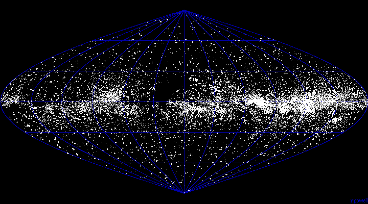 Harita HakkındaBu harita, en az 200 milyar yıldız içeren ve sarmal bir gökada olan Samanyolu'nun tümünü göstermektedir. Güneşimiz, merkezden 26 bin ışıkyılı uzaklıkta, Avcı Kolu'nun derinliklerinde gizlenmiştir. Gökadamızın merkezine doğru yıldızlar, bizim bulunduğumuz yerdekilere göre birbirlerine çok daha yakındırlar. Ayrıca, gökada düzleminin oldukça dışında yer alan küçük küresel yıldız kümelerinin varlığına da dikkat edilmelidir. Yine dikkat edilmesi gereken bir başka konu da gökadamız tarafından yavaşça yutulan bir cüce gökadanın (Cüce Yay) varlığıdır. |