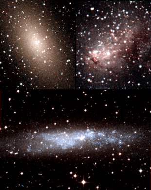 Aşağıda Yerel Grup'ta yer alan dört gökada görülmektedir. M33 Üçgen Gökadası (solda) sarmal yapıdadır ve Yerel Grup'ta yer alan üçüncü en büyük gökadadır. 50 milyar yıldız içerir. NGC 147 (üstte ortada) eliptik bir cüce gökada, IC 10 (üstte sağda) ise düzensiz bir cüce gökadadır. Her ikisi de on milyonlarca yıldız içerir. NGC 3109 (altta sağda), birkaç yüz milyon yıldız içeren bir diğer düzensiz cüce gökadadır ve Yerel Grup içerisindeki küçük gökadalar alt grubunun en büyük üyesidir.