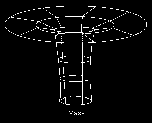 Time Travel Research Center © 1998 Cetin BAL - GSM:+90 05366063183 - Turkey / Denizli Beyond the Event Horizon: An Introduction to Black Holes Imagine a world in which a beam of light rose into the sky only to fall back to the ground at your feet. Or, picture an infinite continuum of parallel universes, each inhabited by slightly different parallel twins of yourself.Visualize a place in which all the laws of physics, that combine to make our universe the place that it is, vanish into inscrutable infinities. Welcome to the world of one nature's most bizarre phenomena: the black hole. Prior to 1905, space and time were comfortable absolutes. Over 250 years of practical experience and experimentation had firmly established the supremacy of the physics of Sir Isaac Newton. The picture of the universe painted by Newton was one of amazing clarity and practical value. The motions of projectiles, pendulums, steam engines, and even distant planets could be readily explained using the brilliant 17th century physicist's theories. Certain phenomena, including how light was able to travel in a vacuum and the exact nature of gravity continued to elude satisfactory scientific explanation. While searching for a solution to the failure of the now famous Michelson-Morely experiment (1), Albert Einstein discovered his Special Theory of Relativity. A few years later, Dr. Einstein expanded his theory into an all encompassing grand view of the universe. His General Theory of Relativity was the first to describe the nature of gravity. The General Theory describes a four dimensional universe in which the three spatial dimensions are coupled with a fourth, time. Any object in the universe with mass is described as causing a warp, or curve into the very structure of space-time itself. Gravity is shown to be a result not of some unseen, mysterious force, yet as a function the curvature of space itself. All matter, from the tiniest sub-atomic particle to the most massive of galaxies, will induce this curvature (2). This idea is frequently explained by describing space as a rubber sheet and a body such as the sun as a bowling ball. If the ball is placed on the rubber sheet, the sheet will bend under the weight of the ball, forming a gravity well (figure 1) . Thus, the orbits of the planets can be seen to result from them "rolling" around the mouth of the sun's gravity well. Of course, it must be realized that this analogy is but a shadow of the true nature of space. In reality, this gravity well is a four dimensional structure.