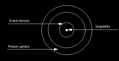 the black hole forever (figure 2) . Figure 2: Diagram of Schwarzchild Black Hole Assuming that we could find a volunteer to journey into a Schwarzchild black hole, what would he experience? Passing through the photon-sphere, he would be flooded with intense light. As our volunteer left the brightness, he would find himself in utter darkness. He would feel his velocity increase to unbelievable levels. Approaching the event horizon, our astronaut would be subjected to tidal forces of astronomical proportions. His feet would seem to weight uncounted trillions of tons more than his head. In a blinding instant, our poor volunteer would be disintegrated into atoms. He would then crash into the singularity, where his mortal remains would be summarily smashed out of existence (4). Black Holes With Angular MomentumThe Schwarzchild black hole, while fascinating, will probably never be found in nature. Since the holes form from stars, and since all stars are known to rotate, any black hole discovered in nature can be assumed to be spinning. As testimony to the difficulty of finding solutions to Einstein's equations, the equations for a black hole with angular momentum (spinning) weren't discovered until 1963. Roy P. Kerr, an Australian mathematician, accidently found the solutions while working on another problem. The spinning black hole is much like the Schwarzchild black hole, with a few interesting differences. The first thing that a traveler into a Kerr black hole would discover is that he was being dragged around the hole as it rotated. For any spinning black hole, there exists an invisible boundary, known as the stationary limit. Within the stationary limit, nothing can escape being dragged around the black hole - unless it can travel faster than light, currently an impossible condition. At the limit itself, a visitor could avoid being dragged around (and remain stationary), providing that he could travel at the speed of light. The region between the stationary limit and the event horizon is known as the ergosphere. Interestingly, it is theoretically possible for matter to escape from the ergosphere, however, it can't escape being dragged around within it. The ergosphere has an unusual shape (figure 3) . It touches the event horizon at the poles, and stretches out to a distance equal to the radius of the event horizon of a Schwarzchild hole of equal mass (5).