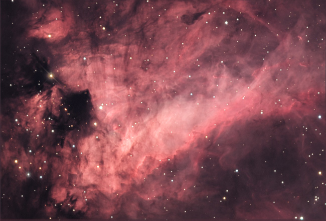 This object also often called the Omega Neblula or rarely the Horseshoe Nebula. This image is deep enough that the "swan-ness" of the nebula is lost in the convoluted turmoil of gas and dust. However if you squint at the screen, you will find that the brightest parts of the nebula make a convincing bird floating on the water with the head (dark area) on the left and the wings extending up and to the right. The body of the Swan is about twelve lightyears long, but that is only the brightest portion. There are fainter, irregular clumps of gas that stretch for forty lightyears or more.