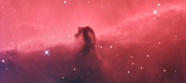 One of the most famous objects in the sky, the Horsehead Nebula is a dark nebula only seen because of the reflection nebula, IC 434, that shines brightly behind it. It carries the designation of Barnard 33, one of many dark nebulae in the Barnard catalog. The other prominent nebula in the bottom center of the image is the Flame Nebula, NGC 2024. Also pictured are IC 432 and NGC 2023, which is a reflection nebula. The prominent star in the image is the eastern most of Orion's Belt stars, Alnitak. This star is rather bright, shining at mag 1.7. The Horsehead itself cannot be seen visually except by larger aperture scopes in very dark skies. Medium aperture scopes and some smaller scopes with fine optics can make out the shape of the Horsehead with the aid of a Hydrogen-Beta filter, but that is the exception to the rule. A filter, dark skies, and big aperture gives you the best opportunity, but this is primarily a photographic object, and a great one at that! Date: