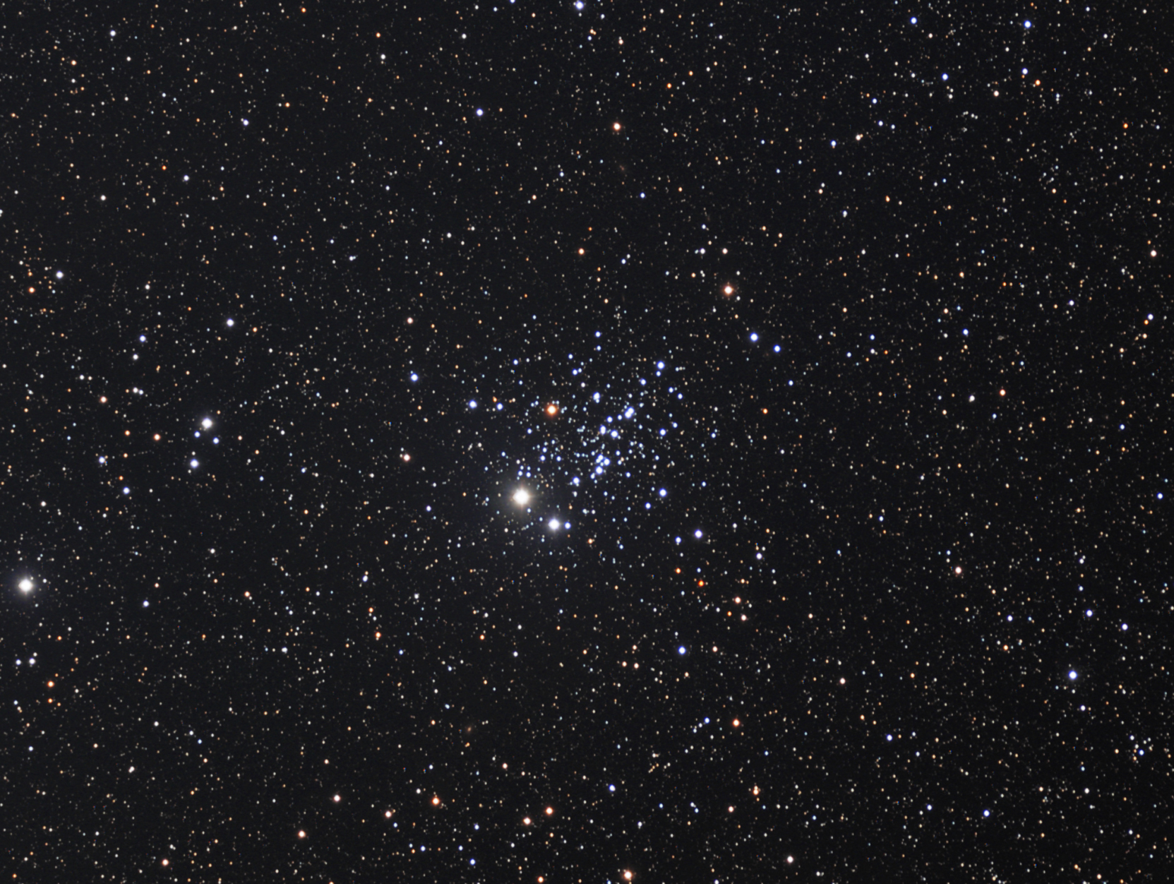 Field Flattener QSI 583WSG Astrodon Gen 2 LRGB L: 12x5min (2x2) RGB: 6x5min each (2x2) Imager Temp -10C 50% Crop The first image from the QSI 583 to have the luminance binned 2x2. My skies are usually marginal enough to be fine for this image scale (2.85 arcsec/pixel) but it still made for pixelated stars in the final image. One benefit was a quicker gathering of data at 5 min subs rather than 10 min subs with clouds rolling in. NGC 457 - The "Owl Cluster" was discovered by F.W. Herschel in 1787 and is also catalogued as Cr 12, Mel 7, OCL 321, Lund 43, H VII-42, h 97, GC 256. This cluster seems to attract nicknames, and has also been called the Kachina Doll Cluster, the E.T. Cluster, the Owl Cluster and the Nazgul Cluster. The brightest star in the cluster, Phi Cassiopeiae is not a member of the cluster, but a foreground star instead. The cluster is about 9000 light years from the sun. September 12 and 13, 2010 © Hunter Wilson -----------------------------------------------------------------------