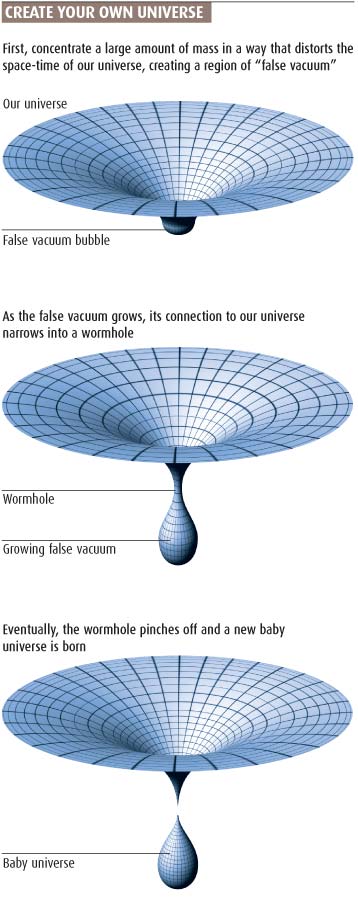 One of the good things about being God is that there's not much competition. From time immemorial, no one else has boasted the skills necessary to create a universe. Now that's about to change. "People are becoming more powerful," says Andrei Linde, a cosmologist based at Stanford University in California. "Maybe it's time we redefine God as something more sophisticated than just the creator of the universe." Linde was prompted to make this wry observation by the news that a glittering prize is within physicists' reach. For decades, particle accelerators have been racking up an impressive list of achievements, including creating antimatter and exotic particles never seen in nature. The next generation of these giant colliders will provide the hunting ground for the elusive Higgs boson, thought to be the source of all mass. These machines might even create mini black holes. Mighty as those discoveries and creations are, however, they pale into insignificance beside what Nobuyuki Sakai and his colleagues at Yamagata University in Japan have now put on the table. They have discovered how to use a particle accelerator to create a whole new universe.