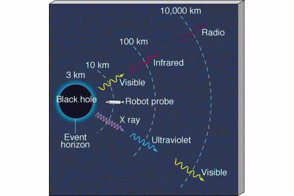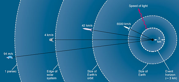 radius" (Rs). A 1 solar mass black hole would have a "Schwarzschild radius" of about 3 kilometers across. At the center of the event horizon is the singularity. This is the geometrical point into which all the mass of the original star has collapsed. A point has no dimensions! Yet that is where all the mass is! This is an abomination to physics. We just don't understand what happens here. The laws we understand break down. The event horizon protects our universe from the singularity. Anything that falls past the event horizon can't get out. Actually the roles of space and time reverse inside a event horizon. The coordinate for distance from the center (r) acts like negative time (-t) and visa versa. This means that once inside the event horizon you are pulled towards the singularity in the same way you are "pulled" towards the future. Once inside the event horizon you have to hit the singularity. In a sense the event horizon protects our universe from the singularity (where all hell could literally break loose) Can there be singularities without event horizons surrounding them? Physicists wet their pants in terror just thinking about. They have even invoked something called "cosmic censorship" which states singularities must always have event horizons around them. What is life like near a black hole. First off - black holes do not suck the entire universe in. If you are not at the event horizon you can, with enough force escape a black hole. Its just like any other gravitating body until you get near R = Rs. Photons which do make it out from