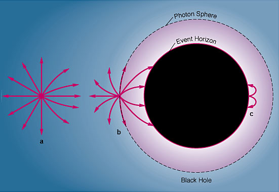 -An event horizon which surrounds a singularity. The event horizon is the place where the escape velocity from the "star" equals the speed of light. Photons at the event horizon orbit it