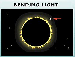 deeper you are in the well. Experimental tests of GR. This is a pretty freaky theory. How do we know its true? The confirmation of GR came in 1918 during a solar eclipse. If Space-Time gets bent by matter then even light rays should have their paths altered as they travel near a massive body. By looking at the relative positions of two stars before and during a solar eclipse astronomers could actually confirm that light paths did indeed get bend by exactly the amount Einstein predicted. It works like this.