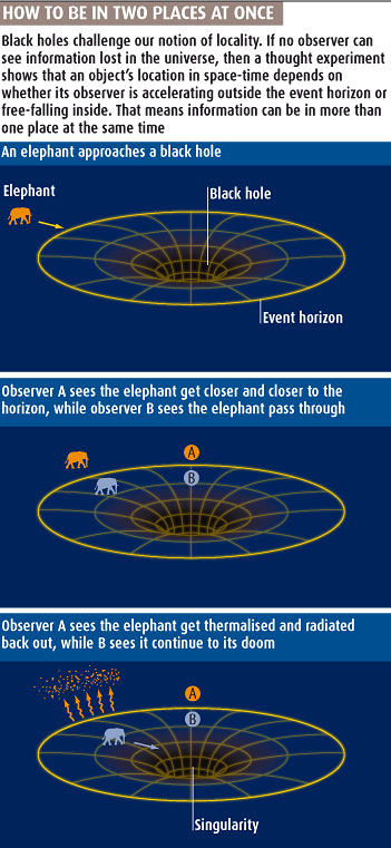 What happens when you throw an elephant into a black hole? It sounds like a bad joke, but it's a question that has been weighing heavily on Leonard Susskind's mind. Susskind, a physicist at Stanford University in California, has been trying to save that elephant for decades. He has finally found a way to do it, but the consequences shake the foundations of what we thought we knew about space and time. If his calculations are correct, the elephant must be in more than one place at the same time. In everyday life, of course, locality is a given. You're over there, I'm over here; neither of us is anywhere else. Even in Einstein's theory of relativity, where distances and timescales can change depending on an observer's reference frame, an object's location in space-time is precisely defined. What Susskind is saying, however, is that locality in this classical sense is a myth. Nothing is what, or rather, where it seems. This is more than just a mind-bending curiosity. It tells us something new about the fundamental workings of the universe. Strange as it may sound, the fate of an elephant in a black hole has deep implications for a "theory of everything" called quantum gravity, which strives to unify quantum mechanics and general relativity, the twin pillars of modern physics. Because of their enormous gravity and other unique properties, black holes have been fertile ground for researchers developing these ideas. It all began in the mid-1970s, when Stephen Hawking of the University of Cambridge showed theoretically that black holes are not truly black, but emit radiation. In fact they evaporate very slowly, disappearing over many billions of years. This "Hawking radiation" comes from quantum phenomena taking place just outside the event horizon, the gravitational point of no return. But, Hawking asked, if a black hole eventually disappears, what happens to all the stuff inside? It can either leak back into the universe along with the radiation, which would seem to require travelling faster than light to escape the black hole's gravitational death grip, or it can simply blink out of existence. Trouble is, the laws of physics don't allow either possibility. "We've been forced into a profound paradox that comes from the fact that every conceivable outcome we can imagine from black hole evaporation contradicts some important aspect of physics," says Steve Giddings, a theorist at the University of California, Santa Barbara. Researchers call this the black hole information paradox. It comes about because losing information about the quantum state of an object falling into a black hole is prohibited, yet any scenario that allows information to escape also seems in violation. Physicists often talk about information rather than matter because information is thought to be more fundamental. In quantum mechanics, the information that describes the state of a particle can't slip through the cracks of the equations. If it could, it would be a mathematical nightmare. The Schrödinger equation, which describes the evolution of a quantum system in time, would be meaningless because any semblance of continuity from past to future would be shattered and predictions rendered absurd. "All of physics as we know it is conditioned on the fact that information is conserved, even if it's badly scrambled," Susskind says. For three decades, however, Hawking was convinced that information was destroyed in black hole evaporation. He argued that the radiation was random and could not contain the information that originally fell in. In 1997, he and Kip Thorne, a physicist at the California Institute of Technology in Pasadena, made a bet with John Preskill, also at Caltech, that information loss was real. At stake was an encyclopedia - from which they agreed information could readily be retrieved. All was quiet until July 2004, when Hawking unexpectedly showed up at a conference in Dublin, Ireland, claiming that he had been wrong all along. Black holes do not destroy information after all, he said. He presented Preskill with an encyclopedia of baseball. What inspired Hawking to change his mind? It was the work of a young theorist named Juan Maldacena of the Institute for Advanced Study in Princeton, New Jersey. Maldacena may not be a household name, but he contributed what some consider to be the most ground-breaking piece of theoretical physics in the last decade. He did it using string theory, the most popular approach to understanding quantum gravity. In 1997, Maldacena developed a type of string theory in a universe with five large dimensions of space and a contorted space-time geometry. He showed that this theory, which includes gravity, is equivalent to an ordinary quantum field theory, without gravity, living on the four-dimensional boundary of that universe. Everything happening on the boundary is equivalent to everything happening inside: ordinary particles interacting on the surface correspond precisely to strings interacting on the interior. This is remarkable because the two worlds look so different, yet their information content is identical. The higher-dimensional strings can be thought of as a "holographic" projection of the quantum particles on the surface, similar to the way a laser creates a 3D hologram from the information contained on a 2D surface. Even though Maldacena's universe was very different from ours, the elegance of the theory suggested that our universe might be something of a grand illusion - an enormous cosmic hologram (New Scientist, 27 April 2002, p 22). The holographic idea had been proposed previously by Susskind, one of the inventors of string theory, and by Gerard't Hooft of the University of Utrecht in the Netherlands. Each had used the fact that the entropy of a black hole, a measure of its information content, was proportional to its surface area rather than its volume. But Maldacena showed explicitly how a holographic universe could work and, crucially, why information could not b