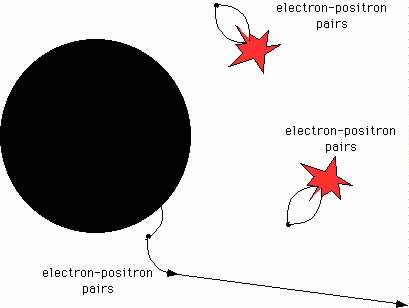 Black Hole Evaporation: Black Holes are not totally black! They can actually emit radiation and in doing so they evaporate! This can happen because of Quantum Mechanics. Near the event horizon quantum fluctuations can produce pairs of matter and anti-matter particles electrons (e-) and positrons (e+). This would not normally violate the conservation of energy because the two particles would collide and annihilate. But if one of the particles get