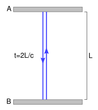 Simple inference of time dilation![]() Observer at rest sees time 2L/c ![]() Observer moving right, sees longer path, time > 2L/c, same speed c Time dilation can be inferred from the constancy of the speed of light in all reference frames as follows: Consider a simple clock consisting of two mirrors A and B, between which a photon is bouncing. The separation of the mirrors is L, and the clock ticks once each time it hits a given mirror. In the frame where the clock is at rest (diagram at right), the photon traces out a path of length 2L and the period of the clock is 2L divided by the speed of light. From the frame of reference of a moving observer (diagram at lower right), the photon traces out a longer, angled, path. The second postulate of special relativity states that the speed of light is constant in all frames, which implies a lengthening of the period of this clock from the moving observer's perspective. That is to say, in a frame moving relative to the clock, the clock appears to be running slower. Straightforward application of the Pythagorean theorem leads to the well-known prediction of special relativity.