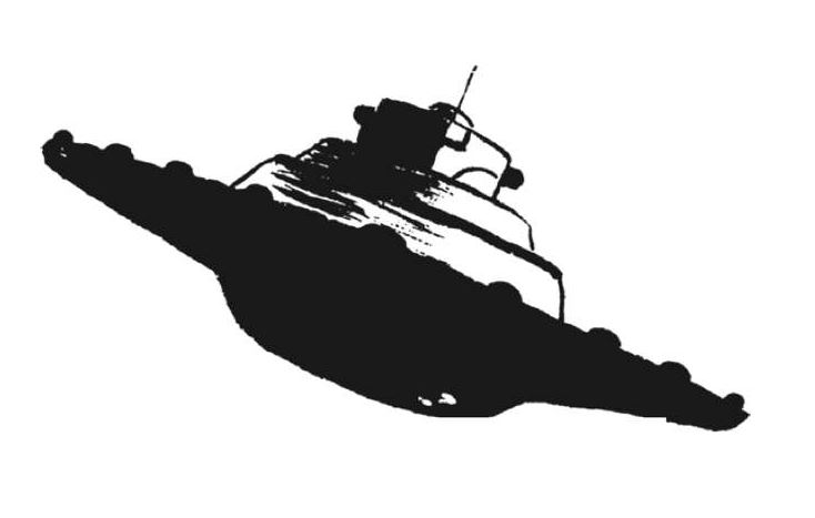 In flight, the expansion shape of the universal protective shield affects forward in a conical-shape, whereby a narrow long-stretched sharp cone is formed. The length of the cone increases with the speed of the craft to an upper expansion limit of maximum 100 times the length of the craft, which for a 7 meter beam ship amounts to 700 meter. Illustration: Kåre Bergheim