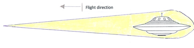The maximum expansion by smaller crafts amounts to ca. 100 times the length of the craft, which by a seven meter ship therefore amounts to 700 meters, while by the largest ships know to Billy, Ptah’s gigantic space ship, the distance of the protective shield expansion amounts to 3500 kilometres. The expansion shape of such a protective shield affects forward in a conical-shape, whereby a narrow long-stretched sharp cone is formed. Such a universal-protective shield normally simply directs every obstacle to the side and out of the flight path of the space ship, whereby it acts as a kind of a hard buffer which under certain circumstances could split a meteorite. In special cases is also the universal-protective shield able to destroy an obstacle, like for example a meteorite. Left: Shape of the universal protective shield surrounding a beam ship in flight.