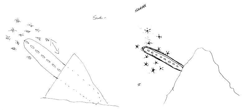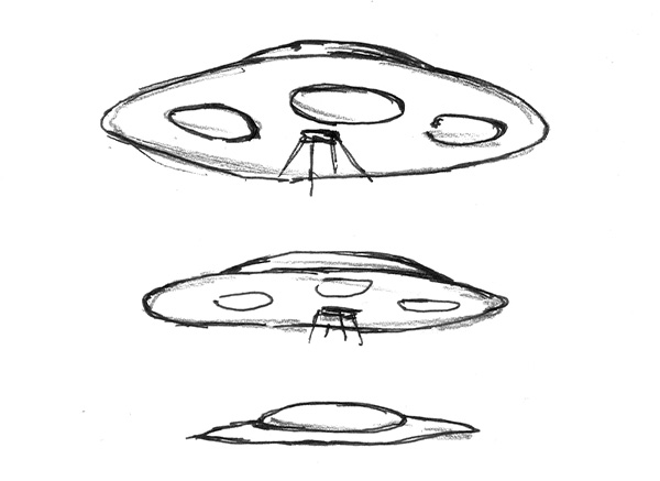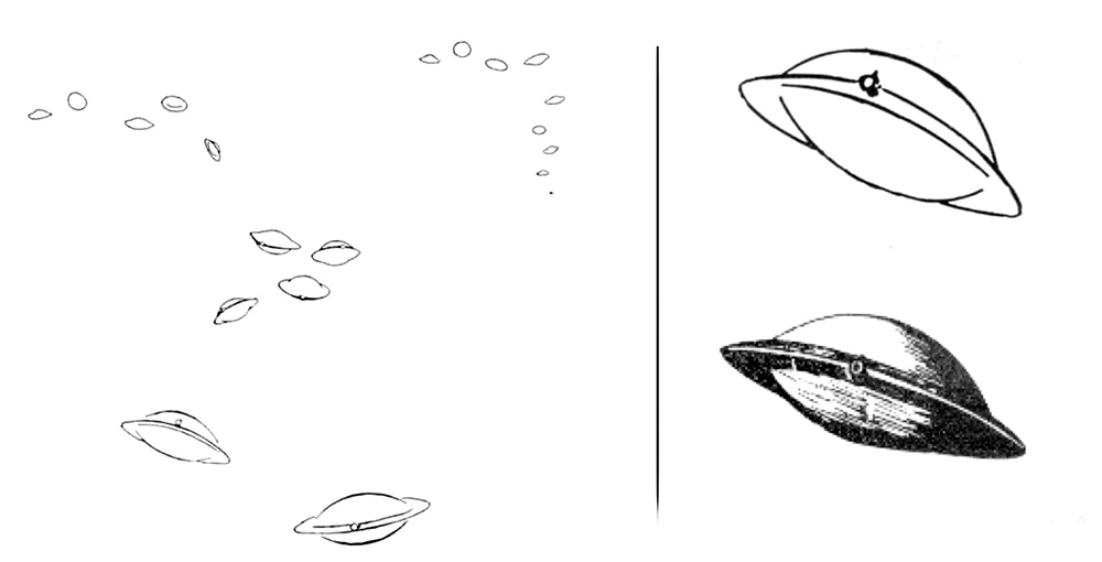 Sue’s drawing at left and Sarah’s on right depicting the UFO disappearing