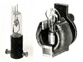Split-anode magnetron from 1935. (left) The bare tube, about 11 cm high. (right) Installed for use between the poles of a strong permanent magnet
