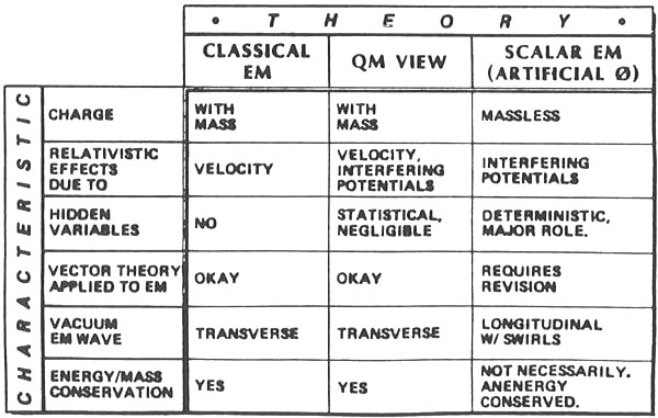 There are actually three kinds -- or three views -- of EM. These are (1) the classical view, (2) the quantum mechanical view, and (3) the scalar EM or electrogravitational view. In the classical view, the potentials are just mathematical conveniences and do not physically exist. The real causative agents are the force fields, and there is no longer any electromagnetics going on if the force fields reduce to zero. Further, the ideas of "charge" and "charged mass" have been made erroneously synonymous. Of course the classical view was formed from the idea of a thin material ether, with electricity as a thin fluid, long before the discovery of the electron. Since most earlier scientists studied string waves and these are transverse, the EM wave was modeled as a transverse wave. Also, detection equipment actually detected transverse waves. The role of electron spin and drift velocity, which would have shown that force-field-causing EM waves in the vacuum could only be longitudinal, was not yet discovered. Maxwell’s equations and the classical approach became so engrained that the basic derivations were never corrected for more modern discoveries. The quantum mechanical view, on the other hand, regards the potentials as the real physical actants, and the force fields are just effects derived from the potentials by differentiating operators. Classically-oriented physicists have adamantly opposed this foundations requirement of QM because it would require nearly a complete redo of EM theory. It would also rather drastically change our ideas of physical reality. For years a controversy has raged around the Aharonov-Bohm effect (which demonstrates the reality of the potentials, among other things). Only this year -- 1986 -- have most physicists finally accepted the AB effect with its implications (see Physics Today, Jan. 86). However, no changes have yet been made to EM theory and the basic classical approach to electrical physics and engineering. Yet even the QM view is flawed, since it has not examined the structure of EM forces which sum to a vector zero. Such a system produces stress, and if the summation is in the vacuum itself, it produces stress of vacuum/spacetime. Rigorously, this is a gravitational effect, and the energies of the various EM components in the local region are locked into an artificial potential. From general relativity, this type of potential where the energy density of vacuum is altered is a gravitational potential. From Kaluza-Klein unified theory, it is at least a 5-dimensiona1 gravitational potential. If the individual force vector components of the vector zero are varying in magnitude -- say, all in phase -- then they produce a gravitational wave. The energy density of the local vacuum is being rhythmically varied. Call such an EM, wave a scalar EM wave, where, by "scalar" we imply that, to an external observer, the EM force vector resultants are identically zero, but the local gravitational potential of the wave is varying. Thus this is an electrogravitational wave, and vector zeroing of EM force fields constitutes a means of changing EM field energy into G-field energy. On the other hand, by breaking up the coherence of the zero-vector summation of the EM forces, nonzero EM resultants are recovered, constituting the change of gravitational energy into EM energy. A simple means to break zero-summed coherence is by interference of two or more such zero-vector waves. In this third view of EM, action at a distance is easily possible, and is the norm rather than the exception. In addition, a new kind of resonance -- scalar resonance -- exists. The scalar EM wave does not interact with orbital electrons, but rather with the interior of the nuclei of atoms. Thus the new scalar EM resonance is between nuclei and within nuclei. BOHM-AHARONOV EFFECT SLIDE 5