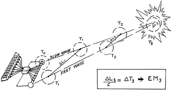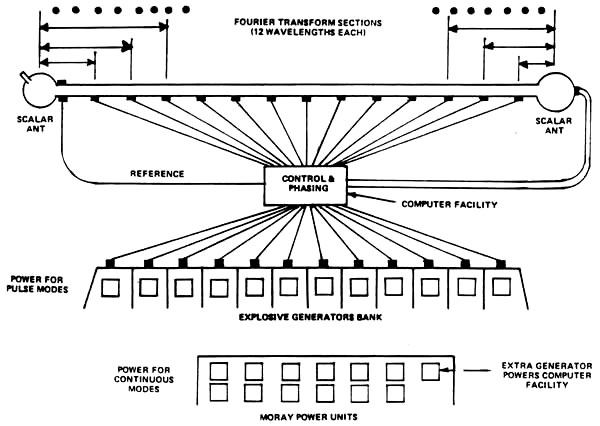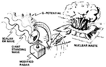 To rehash: scalar waves are zero-vector waves. Patterned E and B fields exist in a relationship where their summation equals vector zero. Electromagnetically, the zero EM "envelope" of a scalar EM wave is composed of a zero-summation of infolded finite EM force-vectors. However, the internal (infolded) substructure is deliberate, macroscopic, and ordered. Vacuum is polarized deterministically by the wave, and macroscopic spacetime is locally curved by it. These substructure components constitute Bohm’s "hidden variables." They can be manipulated and varied at will. Phasing, beaming, frequency, superposition, interference, resonance, and Fourier expansion are the keys to scalar EM engineering. To make a scalar beam, special modifications are made to the EM wave transmitter so that, effectively, the transmitter transmits multiple transmissions simultaneously, and these vectorially sum to zero. This is the same thing as transmitting multiple phase-locked EM force-field beams simultaneously, in the sum-zeroed fashion. Standard beaming antennas and conventional circuits can readily be utilized with slight modifications. Any radar can be converted to a scalar EM radar quite simply. Indeed, a modification kit to accomplish that can be developed and held until the scalar mode is desired. The modification kit can be quickly installed to provide the scalar capability. Scalar radars, for example, cannot track "corner reflector" targets. However, they can magnificently track smoothly filleted corners; rounded, smoothly curved surfaces; and curved or flat metalized dielectrics. Against aerial targets using special construction to lower their cross-section to normal radars, the application of the scalar radar mode is immediately obvious. Scalar waves pass through the electron shells of an atom and interact with the nucleus. They are continually absorbed and emitted by all nuclei in the universe. BACKGROUND FOR THE BRIEFER. Any large collection of nuclei -- such as a star or a planet -- is a strong absorber and radiator of scalar wave radiation. The Sun is a particularly strong source of scalar radiation. This radiation penetrates the Earth deeply, interacting more and more with the deeper layers which, under greater mechanical stress, are more nonlinear. Most of the heat in the molten core of the Earth comes from the dephasing of a portion of this absorbed scalar radiation from the Sun, liberating ordinary EM energy as heat. The Earth also re-radiates scalar wave radiation back to the Sun. The Sun and Earth are thus coupled into a "scalar" system in equilibrium or near-equilibrium. Each body in the couplet possesses both a feed-forward and a feedback loop. The Earth also radiates scalar wave radiation to the Moon, and the Moon reradiates scalar radiation back to the Earth. The Earth and Moon also are coupled into a "scalar" system in equilibrium or near-equilibrium. Again, each body in the couplet possesses both a feed-forward and a feedback loop. The Sun and Moon are correspondingly coupled into a scalar system in equilibrium or near-equilibrium, each with both a feed-forward and a feedback loop. The Earth, Sun, and Noon thus form a triad coupled system of special importance to the stability of our existence here on Earth, and the stability of our biosphere. And so on with all the other planets in the solar system, and combinations thereof. The solar system is thus a very sensitive scalar-coupled system, with strong subsystems within it. ADDED FOR THE BRIEFER: Actually this scalar coupling of the solar system provides a major check on unrestricted use of the large Soviet strategic scalar EM weapon systems. If significant scalar effects are produced on earth in a "pulse" mode, pulsed disturbance of the earth-sun and earth-moon systems results. Here a danger exists that one or more natural resonances of the coupled system may be excited. If the feedback stimulation of the Sun is not insignificant, for example, large sunspot activity may result sometime thereafter, say in a day or two. If too much or too sharp stimulation occurs on earth, the coupled resonant response from the sun could be disastrous. Indeed, a solar response could be stimulated so that the Sun would violently belch and destroy our biosphere, among other effects. The simplest doomsday stimulation would be for a violent expulsion of Solar EM energy and particles to occur. If this were due to resonance, the expulsion of Solar EM energy and particles would continue during some decay time. In that case, fiery destruction of the earth, strongly indicative of Biblical prophecy, would result. Particularly sensitive are the resonances of the sun-earth, sun-moon, and earth-moon systems. Note the abnormal influence of the moon on tides -- tides of both the tectonic plates and the oceans. One cannot help but point out that, if the earth-moon resonant system were overstimulated, one might expect violent earthquakes of extraordinary magnitude, and tremendous tidal waves hundreds of feet in height. (The potential connection to legends of earth-destroying floods, evidences of extreme water levels in mountains, and legends of ancient cataclysmic destruction of supposedly advanced technological oceanic cultures is obvious.) Accordingly, use of huge scalar EM weapons is a double-edged sword. Unless carefully employed, use of the weapons could cause a terrible backlash to the user as well as the victim, and even accidentally cause the destruction of the earth itself. It is not accidental that in 1960 Khrushchev stated that his new fantastic weapon could -- if unrestrainedly used -- destroy all life on earth. This appalling backlash potential is apparently what prompted Brezhnev in 1975 to make so strong an effort to get agreement to outlaw the development of "new weapons of mass destruction" more frightful than the mind of man had even dreamed of. Gromyko even introduced such a draft agreement into the proceedings of the United Nations. The first articl