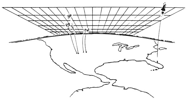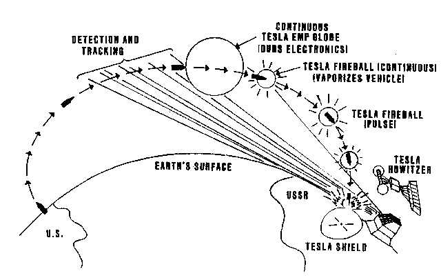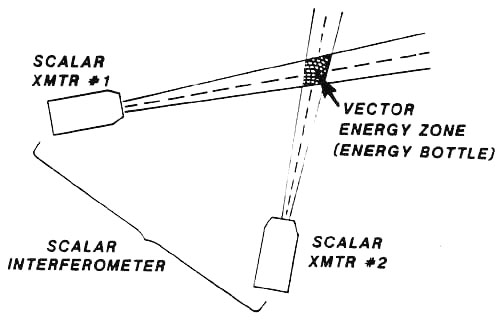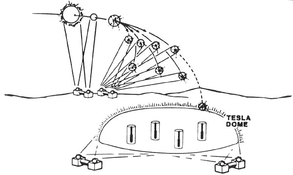 For a scalar interferometer, "del phi" (the gradient of the potential) applies between the transmitter site and the distant intersection site, not to the intervening space in between. Thus one speaks of "energy flow" as being between transmitter and intersection, without any "in between." In the intervening space, all the energy exists as locked-in artificial potential, not EM force field energy (gradient bleed-off of potential). In the exothermic mode, the ground potential of the transmitter is biased well above the ground potential of ambient vacuum. Energy enters the transmitter and "disappears", to "reappear" in the distant interference zone. If continuous wave transmission is used, the energy continuously appears in the distant zone. If pulse transmission is used and timed so that the two scalar pulses meet in the distant zone, energy explosively appears there. If multiple frequencies are transmitted in the manner of a Fourier expansion of a particular geometric form, then a 3-dimensional energy form appears at the distant intersection. In this manner, a spherical or hemispherical shell (a globe or "dome" of EM energy) can be created at a distance. If pulse transmission is used, this will be an impulsive or explosive emergence of that energy form. If continuous transmission is used, this will be a continuous glowing form. By feeding incredibly powerful transmitters with large amounts of energy extracted from the earth’s molten core by "energy taps," very large spherical globes and hemispherical domes of EM energy can be created. The energy in the interference "shell" of such a sphere or hemisphere is sufficiently dense to lift Dirac matter from the Dirac sea of the vacuum. Thus the shell contains a glowing plasma. Many such scalar howitzer signatures have been seen over the oceans, particularly over the North Pacific by jet airliners flying into and out of Japan. Also, such globes and domes of light have been seen deep within the Soviet Union, by observers in Afghanistan and by pilots of aircraft landing in Iran. In the impulsive exothermic mode, a large visible flash will occur if EM energy in the visible spectrum is produced. "Flashes" in the infrared may similarly occur, if the emerging energy is in that spectral band. In September 1979 our Vela satellites detected such a large "nuclear flash" over the South Atlantic, off the southern coast of Africa. A second "nuclear flash" detected by the Vela satellites in 1980 was in the infrared only. Some years ago, a series of anomalous "flashes" and "booms" occurred off the east coast of the United States. These were due to the orientation and alignment -and registration -- of one or more Soviet "scalar howitzers" -- scalar EM interferometers in the exothermic mode. Large "booms" occurred over the shuttle launch site at Cape Canaveral, associated with three shuttle launches prior to the end of November 1985. These were tests of such exothermic scalar EM howitzers, being tested as part of the Soviet Launch Phase ABM system. In that mode, the scalar pulses from the two transmitters are injected into special zero-reference scalar EM "channels" established in the EM carriers of the Woodpecker over-the-horizon radars. The scalar pulses travel through these channels, traveling in the ordinary EM beam of the transmitter and following it in its curvature around the earth in the earth-ionospheric waveguide. The scalar pulses are timed, phased, and oriented so as to meet the rising shuttle. In these tests the transmissions were offset in time so the shuttle would not actually be destroyed, but the system could be tested against actual shuttle launches in the U.S. The specific uses of these various exothermic modes will be covered in later parts of the briefing.