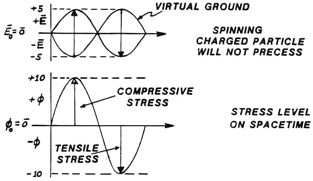 Thus the energy density of vacuum varies with x. But, rigorously, since the resultant E and B fields are zero, this describes a standing gravitational wave. Hence we have a standing EG wave, existing in the resonant cavity. This is an example of scalar resonance. Rigorously the cavity has mass and inertia, to an outside observer, as a result of the two warps in spacetime it contains. Note that in one half-cycle the energy density of vacuum is greater than ambient, and in the other half-cycle it is less. In the region of one half-cycle, time flows at a faster rate than to the ambient observer, and in the other half-cycle time flows at a slower rate than to the ambient observer. One half-cycle appears to contain negative electrical charge, and the other appears to contain positive charge. One half-cycle appears to contain a north pole (positive magnetostatic scalar potential), and the other half-cycle appears to contain a south pole (negative magnetostatic scalar potential). Perhaps now one can begin to understand why a continuously accelerated orbital electron in the atom does not radiate EM energy, completely in violation of Maxwell’s equations. The electron is naught but a complex aspect of a standing scalar resonance, existing between the nucleus and the orbit.