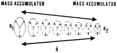action of h/(4 In the normal linear spacetime, the "charging" and ’’discharging" are equal in all directions; hence the "mass" exhibited in any direction is the same. With respect to an "external observer’s" equilibrium flux, a moving object encounters an increased amount of flux rate along its line of motion, just as a moving object in a rainstorm encounters more raindrops per second in the direction of its path, than does a stationary object. Encountering increased scalar wave flux (with respect to the external observer) forces the moving object to absorb and emit scalar waves at a higher rate along its direction of motion than when it is not moving. Thus to the external observer, the mass of the object has increased, insofar as any disturbing force along its line of motion is concerned. At right angles to its line of motion, however, the flux rate is precisely the same as when the object is at rest. Therefore the "mass" of the moving object with respect to any disturbing force at right angles to its line of motion has not changed, as seen by the external Lorentz observer. Thus is explained both parts of one of the alltime great mysteries of special relativity: (1) how the mass of an object increases with respect to its motion, and (2) why the mass only increases with respect to its line of motion, and not at right angles to it. The inertia of a particle is due to its mass, i.e., to the total magnitude of its trapped scalar resonance. The gravitational attraction between two masses is due to their spacetime curvature. Further, mass is like a capacitance. It can trap additional scalar waves as trapped resonance; hence increase its magnitude or "inertial charge." Or, it can discharge more scalar waves than it absorbs; hence decrease its magnitude or "inertial charge." Those scalar waves emitted from resonance are emitted as a pattern ensemble of the resonance. Hence they may be regarded as constituting a current of scalar resonance leaving the mass-accumulator-object. Scalar waves absorbed into trapped resonance may be regarded as constituting a current of scalar resonance into the mass-accumulator-object. Thus it is proper to speak of scalar resonance as being able to "flow." Further, it is possible to increase the mass of an object directly, by transmitting scalar EM waves to it so that it absorbs them. (By "absorbing" scalar waves one means that more enter the object than leave it, so the object acts as an inertial accumulator charging up with inertial charge. This is done by insuring that the reference potential of the scalar wave transmitter is higher than the reference potential of the irradiated object.) It is also possible to decrease the mass of an object directly, by transmitting scalar EM waves to it so that it emits more than it absorbs. (By "emitting" scalar waves one means that more leave the object than enter it, so the object acts as if it were an inertial accumulator that is discharging its inertial charge. This is done by insuring that the reference potential of the scalar wave transmitter is lower than the reference potential of the irradiated object.) As can be seen, the scalar wave "transmitter" is actually somewhat comparable to a heat pump; it can either act as an "energy transmitter" or as an "energy extractor," depending upon the difference in potential between "transmitter" and "receiver." Finally, scalar resonance can have a specific pattern: both in frequency and in spatial curvature aspects, as well as "rate of flow of time" aspects. Indeed, scalar-wise every object has its individua1 "scalar pattern" which is a unique fingerprint. Since that print is spatiotemporal, it is a product of the object’s entire past history. Thus -- scalar-wise -- no two objects are identical. This brings up another rather amazing potential: If a reasonably precise scalar pattern of an object can be "irradiated" and resonated with scalar waves, energy may be created in or extracted from the distant object, just as stimulating one tuning fork can excite another at a distance by sympathetic resonance. We leave it as an exercise for the reader to ascertain the relevance of this statement to clairvoyance, radionics, remote viewing, etc. For the skeptic, however, we must point out that -- rigorously -- quantum mechanics requires that, continually, in any localized region of spacetime, the "pattern" of any object in the universe appears momentarily in the virtual state, purely from statistical considerations alone. So long as the situation remains statistical, any place in the universe can continue to have the "ghosts" of everything present there, in an ethereally thin pattern, and the observable world will not be affected by it. However, if one can discriminate and scalarly "charge" or "discharge" individual patterns in this "ghost-realm," action-at-a-distance is directly possible, as is materialization and dematerialization. if one accepts that even thought itself produces such virtual "ghost-patterns" in the virtual particle flux of vacuum, then it is at least theoretically possible to even materialize thoughts and thought images. We have entered a new kind of reality where the old rules and the old limitations do not necessarily apply. SCALAR RESONANCE CURRENTS SLIDE 36