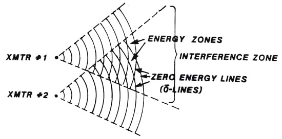 On this slide we show the orthodox representation of EM wave interference. The chart is stylized since we assume two single-frequency EM waves which intersect and interfere in the indicated region. In the interference zone, in-phase wave amplitudes add (constructive interference) while out-of-phase wave amplitudes subtract (destructive interference). In our stylized mode, we show the zero-summed locations as lines. Conventionally, these interfering waves are considered to be transverse waves in vacuum. The point is, in this scheme we think of "putting in the waves of finite amplitude, and creating the zero-amplitude regions by destructive interference." We create additional waves of increased-amplitude regions by constructive interference. Note that this view is only half correct. It addresses the electromagnetics, but not the gravitational aspects. Actually the regions of destructive EM interference are regions of constructive G-interference, and the regions of constructive EM interference are regions of destructive G-interference.