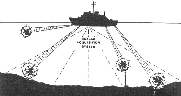 Nikola Tesla also planned a very special use for his endothermic scalar interferometer. He planned to produce what he called his "big eye to see at a distance." This is accomplished as shown on the diagram. First, the system is only weakly endothermic, so that only a small amount of energy is extracted from the distant target. Also, the beams are "scanned" by an open receiver, timewise, from side to side and top to bottom. By scanning yet another single beam through the intersection zone and phasing its pulses, an even better representation can be obtained. Thus the receiver produces a representation of the energy extracted from various locations within the distant endothermic zone. By displaying the received signals on an appropriately scanned screen, a representation of the distant scene in the intersection zone can be created. Indeed this is a special kind of "microwave interferometry," and -- with modern techniques -- the imagery obtained might be surprisingly good. With development, it might even become as good as the image presently obtained by side-looking acquisition radars. Interestingly enough, since scalar EM beams will easily penetrate the earth or the ocean, one can also look beneath the earth or beneath the ocean with this type of scanning scalar interferometer. The importance of this capability to strategic and tactical reconnaissance is obvious. Camouflage, cover, and concealment have no effect on such a system. One can easily look inside buildings and into underground facilities. With a small system such as this, the U.S. Marines at Khe Sahn would have had little difficulty locating the tunnels continually dug under the perimeter by the Viet Cong. And targets under jungle canopies are directly visible. BACKGROUND FOR THE BRIEFER: It requires little imagination to see that this system is easily adapted to produce an "underwater radar." With such devices, the problem posed by the underwater nuclear submarine is solved. For example, an entire area can be continually searched, much like acquisition radar systems do now. A submarine can be detected and tracked, and none of its ordinary detectors will detect anything out of the ordinary. By using a separate pair of beams in the exothermic mode, powerful scalar pulses can be fired at the distant sub, intersecting at the submarine in a violent EMP throughout the sub and its armament. Thus the sub and all its missiles are destroyed instantly. Or, continuous exothermic transmission can be used by the targeting weapon at lesser power, gradually interfering with the sub’s electrical systems and causing it to lose control. The sub then sinks to crush depth and implodes. Precisely that scenario seems to be what happened on April 10, 1963 to the U.S.S. Thresher nuclear submarine. It left a signature: the sub’s surface companion, the nearby U.S.S. Skylark, was in the "splatter zone" of the underwater scalar interference. That is, spurious EM noise was being generated in all the Skylark’s electrical systems, some of which were actually disabled. So intense was the "electronic jamming" that it required over an hour and a half for the Skylark to transmit an emergency message back to its headquarters that the Thresher was in serious trouble and contact with it had been lost. Some of the Skylark’s communication systems actually failed, but later resumed operation inexplicably, once the jamming was gone. That type of "jamming" of multiple bands and multiple electronic equipments, of course, together with the anomalous failure of electronic equipment and its later mysterious recovery, were direct signatures of the use of the exothermic scalar interferometer against the undersea target area in the vicinity of the Skylark. The very next day, Apr. 11, 1963, the same Soviet scalar EM howitzer system was tested in the "destroy submarine" pulse mode. A huge underwater EM blast occurred off the coast of Puerto Rico, about 100 miles north of the island. The underwater explosion caused a huge boiling of the surface of the ocean, followed by the rising up of a giant mushroom of water about a third of a mile high. The mushroom of water then fell back into the ocean, completing the signature. Fortunately the entire incident was seen by the startled crew of a passing U.S. jetliner which was just passing its checkpoint in that area. (See Robert J. Durant, "An Underwater Explosion -- or What?", Pursuit, 5(2), April 1972, p. 30-31.) These two incidents were full-up operational tests of Khrushchev’s newly-deployed superweapons. He probably staged this dramatic one-two punch in a desperate effort to recover face with the Communist Party after his disastrous facedown by Kennedy in the Cuban Missile Crisis a few short months previously. Apparently the attempt was successful, since he remained in power another year before being deposed. SITE OF MYSTERY CLOUD SLIDE 43