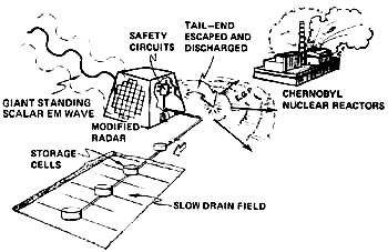 Figure 9. EGP initiation of the Chernobyl event. Failure of another giant transmitter near Chernobyl in 1986 eventually caused the eruption of one of the Chernobyl reactors by EGP-pulsing its nuclear fuel rods. When the transmitter failed, the alarmed Soviets shut down the four Chernobyl reactors while waiting for drain-off of the EGP potential by the safety circuits of the disabled transmitter. These circuits finally gave way, producing a mild EGP pulse into the earth. Had they failed immediately, all four reactors at Chernobyl would have violently exploded. Note: a full explanation of Tom Bearden's involvement in the Chernobyl disaster is recounted in his latest book "Fer de Lance"