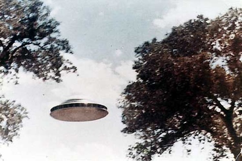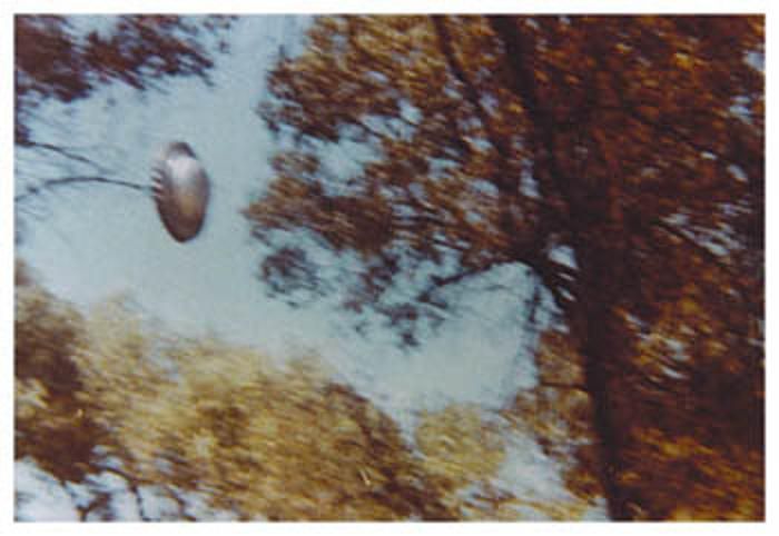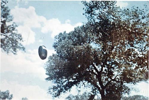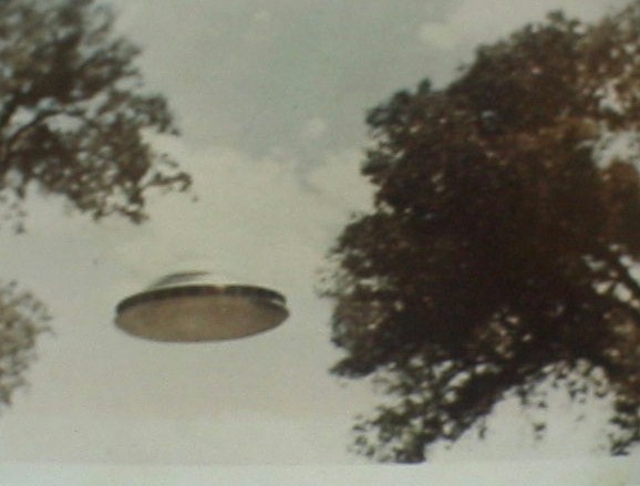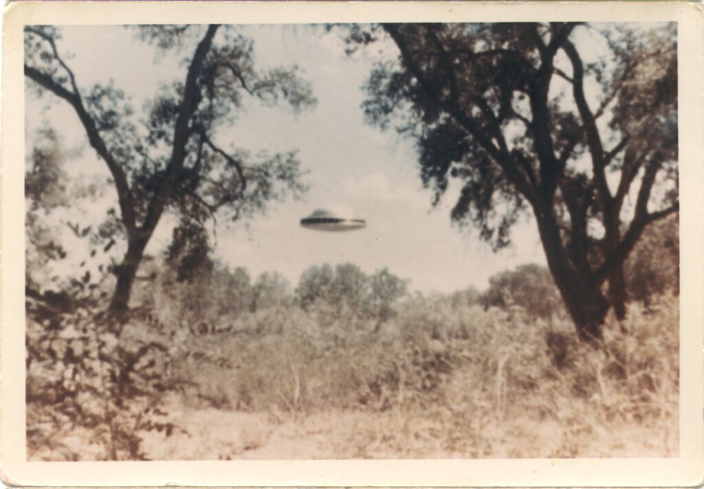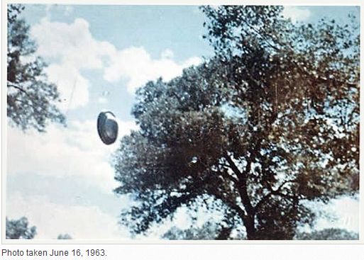Photo taken June 16, 1963. The occupants of the UFO "permitted Villa to take photo's of their ship which posed and hovered close to the surface between 2 and 4P.M. while he took various shots of the craft framed by the trees in the foreground. He used a Japanese-made Rokuoh-Sha camera with an f4.6, 75mm lens loaded with 120 Kodak film."