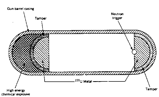 Little Boy: Gun-type uranium bomb To prevent spontaneous detonation of an atomic bomb, the fissile material is kept in a subcritical configuration. It is then rapidly assembled into a supercritical mass using conventional explosives. Once the bomb has achieved this mass, any neutron introduced into it will be likely to initiate a chain reaction. The mechanism for "Little Boy", the U-235 bomb, was a gun that fired one subcritical piece of U-235 into another to form a supercritical mass. The pieces had to be assembled within a time less than the average time between appearance of a spontaneous neutron from either U-235 or cosmic radiation. A conventional explosive in an artillery barrel could fire the U-235 mass at speeds of a few millimeters per second, fast enough to prevent a fizzle caused by a spontaneous neutron setting off a premature chain reaction. Originally, the gun-type mechanism was planned for both the U-235 and Pu-239 weapons. However, a problem arose with the Pu-239 bomb that required a different assembly mechanism. A small amount of Pu-240 is produced with the Pu-239 in the reactor. Pu-240 emits large numbers of neutrons spontaneously: 1,030 neutrons per gram per second compared with 0.0004 neutrons per gram per second for U-235. Even at a concentration of 1% Pu-240 in the fissile Pu-239, the required mass of Pu emits 52,000 neutrons per second or one neutron every 20 microseconds. Thus, it is very probable that a neutron from Pu-240 will initiate a premature chain reaction during the critical last 100 microseconds in a gun-type assembly. This problem was discovered in mid 1944, well after the start of construction of the massive Hanford plutonium production facilities.