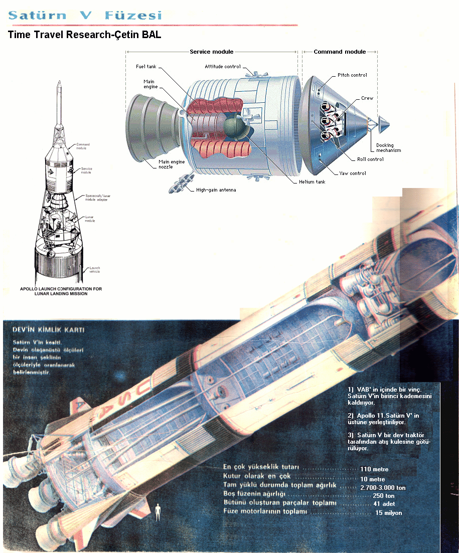 Zaman Yolculuğunu Araştırma Merkezi © 1998 Cetin BAL - GSM:+90 05366063183 -Turkey/Denizli Satürn V Füzesi Yeryüzü ile Ay arasındaki gezinin dev ''uzay otobüsü '' Okyanusu bir baştan öbür başa geçmek için bir gemiye, ya da hiç değilse bir kayığa ihtiyaç vardır.Bir kıtayı geçmek için uçaktan, trenden, otomobilden yararlanmak, ya da bu işi yürüyerek yapmak gerekir.Fakat Ay'a insan gönderebilmek için yararlanabileceğimiz tek araç füzedir.Tarihin ilk füzesi niteliği taşıyan bu aracın adı Satürn V 'dir. << İkinci Kuşak>> : SATÜRN'LER Amerika'lı bilginler, Ay yüzeyine insan indirmek için giriştikleri çalışmalar sırasında, o güne kadar yaptıkları füzelere göre çok daha kuvvetli tipte yeni füzeler meydana getirmek zorunda olduklarını sezinlemişlerdi: Eldeki örnekler, Mercury ve Gemini Kapsülleri'ni fırlatan Redstone'dan, Atlaslar'dan ve Titanlardan ibaretti.Mercury'ler ilk defa 1962 yılında bir Amerikalı'yı yörüngeye oturtmuştu.Gemini'ler 1965 ve 1966 yıllarında uzaya iki insan göndermişti.Bilginler << Birinci Kuşak>> füzeler dosyasını kapatıp, doğrudan doğruya Ay'a yönelik << İkinci Kuşak>> füzeler üstünde çalıştılar.Satürn'ü gerçekleştirmek için çözüm yolunu araştırıp buldular:İtici gücü en yüksek düzeye ulaştırmak için bir << füzeler salkımı>> yani çok katlı birbirine eklenmiş füze sistemlerini kullanacaklardı.Bu, Sputnik'le Gagarin'in Vostok 'unu yörüngeye oturtan Sovyet'lerin A-2'sine benzer bir şey olacaktı.Satürn 1, bu koşullar altında ortaya çıktı.Yüksekliği 60 metre, fırlatma sırasındaki ağırlığı 600 tondu.1964'te bu füze aracılığı ile Apollo kapsülü Dünya Yörüngesine oturtulmuştur.1966 yılında yapılan Satürn 1B'nin motorları çok daha güçlüydü.Yörüngeye oturtacağı ağırlığın da aynı ölcüde büyük olacağı ön görülmüştü.Fakat bu Satürn'ün de << Apollo Sistemi>> ni Ay'a götürecek nitelikte olmadığı biliniyordu.İnsan yönetimindeki uzay araçları Ay'a ulaştıkatn sonra tekrar yeryüzüne dönebilecek güçte değildi. SATÜRN V Büyük girişimi başaracak füze nihayet tamamlanmıştı: Satürn V...İlk uçuşu 1967 yılında gerçekleştirilmiş fakat 1969 Temmuzunda yapılan yeni yeni bir deneme sayesinde Satürn, tarihin en büyük başarılarından birini sağlayarak, insanoğlunu Ay'ın yüzeyine indirmiştir. O günden bu yana, birbirini izleyen uçuşlarda Amerika'lılar, dünyanın en güçlü füzesi Satürn'den faydalanmışlar ve AY'a insan göndermişlerdir. Birinci kademe Tüm aracın havalanmasını sağlayan kademedir.Yaklaşık 42 metre uzunluğundadır.Kutru 10 metredir.Boş iken ağırlığı 130 tondur.Tam olarak doldurulduğunda ağırlık 2,135 tona çıkmaktadır.Bu ağırlığın 1 milyon 500 bin kilosunu sıvı oksijen, 520 bin kilosunu sıvı oksijen, 520 bin kilosunu da kerosen oluşturmaktadır.F-1 tipi beş motorla harekete geçmektedir.Bunlardan her biri 680 ton tutarında itiş gücüne sahiptir.Bu motorlar saniye başına 14 ton tutarında itici yakıt harcamaktadır.Bunlar sadece iki buçuk dakika süreyle yanmakta ve 2 bin tonun üstünde yakıt harcadıktan sonra füze ağırlığının üçte iki oranında hafiflemesini sağlamaktadır.Uçuşun başlangıç evresinde olası yön sapmalarının düzeltilebilmesi için dıştaki bu dört motorun kontrol edilmesi olanağı vardır. İkinci kademe Yaklaşık 25 metre uzunluğunda ve 10 metre kutrundadır.Tam dolmuş haldeki ağırlığı 468,5 tondur.J-2 tipi dört motorla çalışmaktadır.Bunlardan her biri 100 ton tutarında itme gücüne sahiptir.Bu iş için saniyede bir tondan fazla hidrojen ve sıvı oksijen yakıt harcamaktadır. Üçüncü kademe 18 metre uzunluğunda ve 6,6 metre kutrundadır.Boş durumda ağırlığı 9,5 ton. dolu iken 18 tondur.İkinci kademedeki donatımın benzeri bir J-2 tipi motorla çalışır.Uzay Gemisi Apollo'yu, önce yeryüzü yörüngesine, ardından Ay yörüngesine oturtma göreviyle yükümlü olduğundan üstüste çalıştırılma olanağına sahiptir.Durdurup tekrar yakma işlemleri, gerekli anlarda kolaylıkla uygulanabilir. GEREÇLER TOPLULUĞU Füzenin << beyni >> ni oluşturan tüm aygıtların yerleştirildiği yuvarlaktır:Bunlar uçuşu, yönetimi, aracın topyekün kontrolünü, verilerin de aşağı aktarılmasını sağlamaktadır.Gereçler topluluğu üçüncü kademenin üst bölmesine yerleştirilmiştir.Yüksekliği 91 santim, kutru 6,6 metre. ağırlığı 1,950 kilodur. UZAY GEMİSİ APOLLO Bunun adına << yararlı yük >> denilmektedir.Füze aslında bunu götürmekle yükümlüdür.( İkinci kademenin ayrılmasından önce atılan cankurtaran kulesi hariç ).Tek başına kalan << yararlı yük >> daha sonra Ay yörüngesine oturacaktır.Yaklaşık olarak 25 metre uzunluğunda ve 50 ton ağırlığındadır.Beş bölmeden oluşturulmuştur: Can kurtaran kulesi, kumanda modülü ( üç uzay adamı burada oturmaktadır ve daha sonra yeryüzü' ne dönecek bölme de budur ), servis modülü, adaptör (Ay Kapsülü bunun içindedir), ay modülü. HERŞEY << ÖLÇÜ DIŞI>> Satürn V ile ilgili tüm ayrıntılar ölçü bakımından alışılmışın çok dışındadır.Satürn V in montajını sağlayan bir tesisi var.Bunun adına VAB deniliyor.Yüksekliği, yaklaşık olarak 160 metredir.Oylumu 3 milyon 900 bin metre küp tutarındadır.Böylesine bir genişlik nedeniyle içinde sürekli olarak hava düzenleyiciler çalıştırılmadığı taktirde bulut tabakaları meydana gelebilmektedir.Montaj işi tamamlandıktan sonra Satürn V 'i VAB'dan alıp atış kulesine götüren taşıyıcı da dev ölçülere sahip bir vinçtir.Bir futbol sahasının yarısını kaplayacak genişliktedir.Ağırlığı 3.000 tondur.Diğer bir deyimle 24 lokomotifin ağırlığına eşittir.Satürn V en azından 36 katlı bir gökdelen kadar yüksektir.Tam yüklü olduğu zaman bi