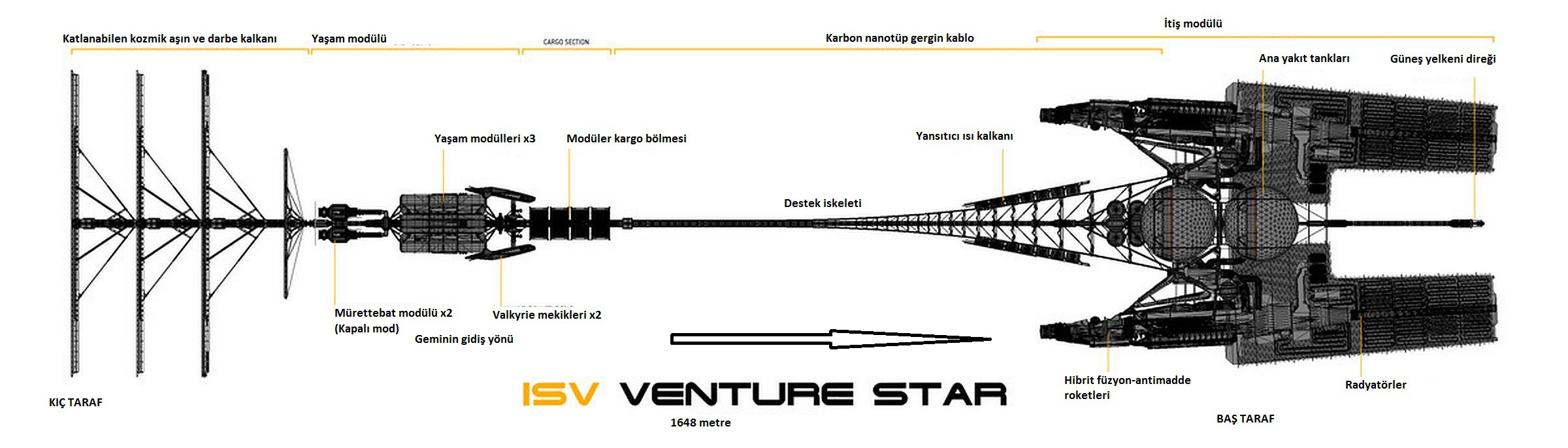 gemi sadece uzayda gitmek üzere tasarlanmış, çünkü 1648 metrelik boyuyla