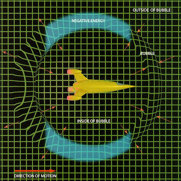 Sevgili zaman yolculuğu araştırmacıları uzun yıllardır bu konuları araştıran bir amatör bilim insanı olarak genelde bilimin uç noktalarında gezen ve UFO olayları ve parapsişik hadiselerin kıyısında dolaşan araştırma çizğimden dolayı akademik çevrelerde pek dikkate alınacağım kanaatinde olmasamda bilmenizi istediğim şey gerçek anlamda bir ışınlama fenomeni, zaman yolculuğu fenomeni, üstboyutlara geçme hadisesi, görünmezlik fenomeni, antiçekim (Antigravitasyon fenomeni ) fenomeni aslında bir UFO teknolojisinin(elektro-gravitik sevk) yapısında birleşen fenomenler dizisidir. Araştımalarım ve bulgularımın beni getirdiği nokta UFO ' yu çevreleyen güç alanı aslında çok bilinen elektromanyetik güç alanıdır.Tüm bu bahsetiğim fenomenleri yaratan şey bu elektromanyetik alan gücünün yoğunluk ve frekans kriterleri yanında henüz ışık enerjisinin tam çözülememiş '' iç titreşim döngüleri ve biçimleri '' üzerinde tam bir yapay kontrole ( ışığın hız yapısının ayarlanması) dayanır. Ve bu kontrol bizi kendi uzay-zaman sürecimizin dışına doğru bir geçit açarak diğer boyutlara taşıyacaktır.Bir aralar Bilim ve Teknik dergisi karadelik hakkında en gerçekçi açıklamaya yer vermiştir. Ki bu benimde hemfikir olduğum bir açıklamadır.Bu açıklamaya göre : Karadelik Nedir ? ... peki karadelikler gerçekten delik mi ? Bunu yanıtlamak için deliğin ne anlama geldiğine bakmak lazım. Sözlükteki bir tanıma göre delik katı bir kütle içinde boş bir alan ; bir kovuk. Pek çok kimse zihinlerinde karadelikleri buna uyan bir biçimde , yani uzay içinde bir bir oyuk , bir boşluk biçiminde canlandırıyorlar. Oysa karadelikler boş değil. İçleri son derece yogun maddeyle tıka basa dolu. İçine eğer - başarabilirseniz - parmagınızı sokup sağa sola oynatabileceğiniz bir delik delik değil. Bu anlamıyla da delik, bir şey içinde uzanan bir yol , bir geçit. Bazılarımızda karadelikleri bu anlamıyla algılayıp, evrenin değişik bölgelerini birleştiren , içinde ışık hızının kat kat ötesinde hızlarla zaman içinde ileriye yada geriye yolculuk yapılabilecek koridorlar olarak düşünüyorlar. Einstein' ın denklemleri bu konuda kesin bir şey söylemiyorsa da , bilim adamları bu bilim kurgusal ''kurtdeliği'' modelinin geçerli olmadığı görüşünde birleşiyorlar. Sonuçta bu fikrin ben, olgun bir bilimsel anlayışın ürünü olarak ''bu böyledir'' denen kesin bir düşünce olduğunu sanmıyorum. Zira Stephan Hawking ve Kip Thorne gibi akademik kariyer sahibi kuramsal bilimcilerin bu uç noktalarda yürüttükleri fikirler, bu karadelik modelinin bir versiyonu olan solucan deliklerini kuantum vakumu düzeyinde aramaya kadar gitmiştir.Ve bu büyük beyinler zaman yolculuğunun bu solucan delikleri, kurtdelikleri yada diğer ismiyle bu tırtıl yollarının sayesinde olası olabileceğini vurgulamaktadırlar. Ve yine bu saygın bilimsel kişilikler arasında dünyaca tanınan Türk asıllı bilim adamı Ulvi Yurtsever 'de uzay-zamanda böyle kestirme yollar olabileceğini olası görmektedir. Aslına bakarsanız tüm bu kuramsal düşüncelerin altında yatan temel fizik karadelik fiziğidir. Ve bu fiziğinde dayandığı sütun Einstein 'ın genel görecelik kuramındaki yoğun kütleler çevresinde eğrilen uzay-zaman 'ın fiziği dir. Benim kendi özgün araştırmalarım zaman yolculuğunun bir çeşit uzay-zaman eğriliği yöntemiyle olduğunu ortaya koymuştur. Fakat bilimin bu eğrilikten neyi kast ettiği bilimciler açısından bile tam olarak anlaşılmış değildir. Ama ortada olan ve dilden dile gezen bir eğrilik kavramı vardır. Einstein 'ın klasik demeçleri dahilinde..! Kesin olan bir şey var ki ışıktan hızlı yolculuğun anahtarı bir HYPERSAPACE denen hiper uzay yada üst uzay kavramında saklıdır. Ve ''karadelik fiziği'' - bugünkü solucan deliği fiziği- anlayışıyla doğrudan böyle bir seyahate çıkamayız. solucan delikleri ve karadelikler aslında bir tür geçit vermeyen kapalı uzay çukurlarıdır. Fakat bu çukur, kendi boyutumuz içerisinde yoğun enerji girdapları çevresinde doğan hafif bir zaman kayması etkisidir. Yani uzay-zaman çizgileri dokusunda bir eğrilik ! Uzaya bağlı eşzamanlılık örtüsündeki hafif zaman kaymaları etkisiyle meydana gelen kırışıklıkları biz salt uzay çizğilerinde bir burulma ve eğrileşerek çukurlaşıp inişli - çıkışlı tepecikler oluşturan düzlüğünü yitirmiş( eşzamanlılığı bozulmuş) bir uzay zemini olarak algılarız. Derin öngörülerim dahilinde bugünün bilim anlayışı içerisinde arkası tam olarak anlaşılmadan söylenen bazı fikirler gelecegin dünyasında ki nihai gerçek sistemlere yakın modellerdir. Bunlardan biri Wales üniversitesinden fizikçi Miguel Alcubierre 'nin sunduğu bir uzay aracı modelidir.Aşağıda Alcubierrenin ifade ettiği tarzda uzay aracının çevresindeki uzay/zaman çizğilerinin bükülmesi açıkca görülmektedir.